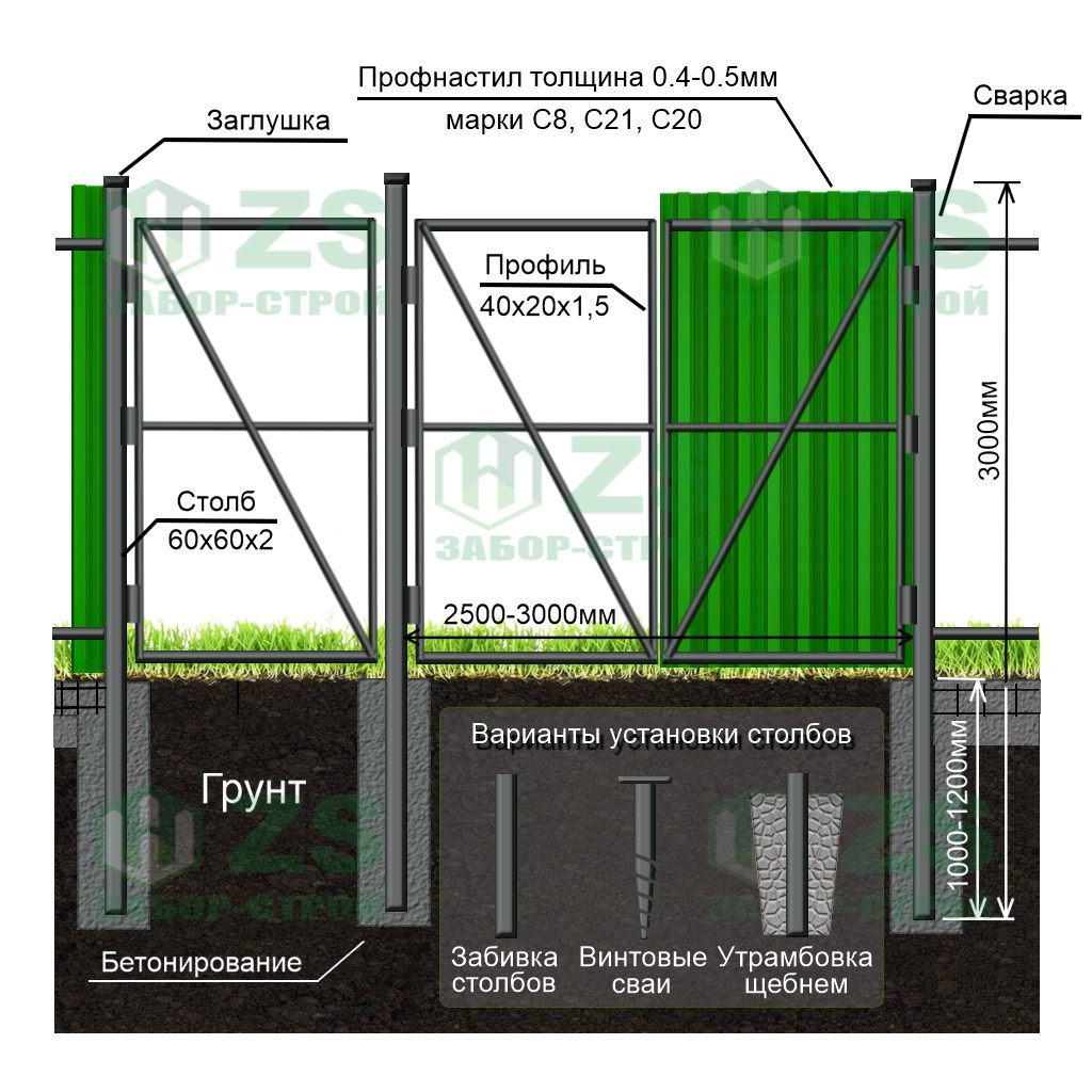 Конструкция распашных ворот из профнастила:
