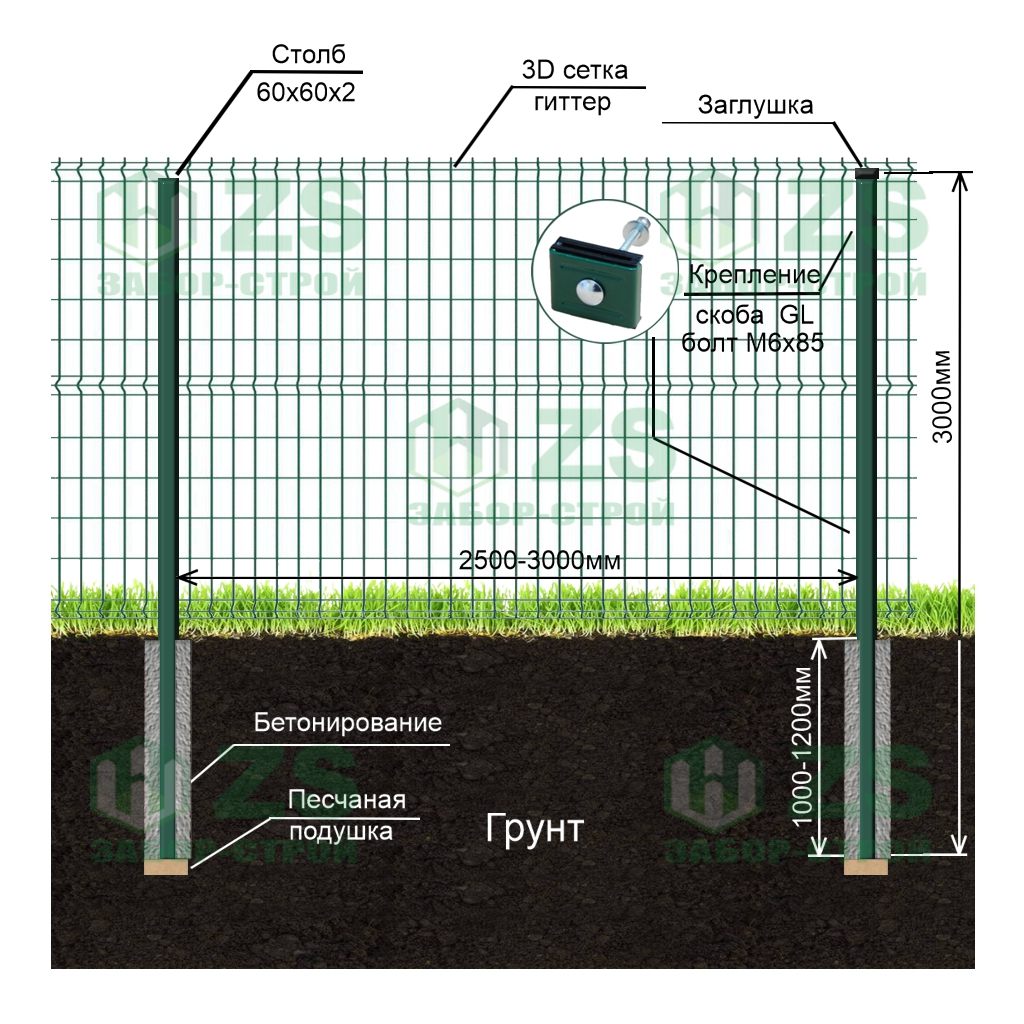 Конструкция забора из 3Д панелей с бетонирование столбов: