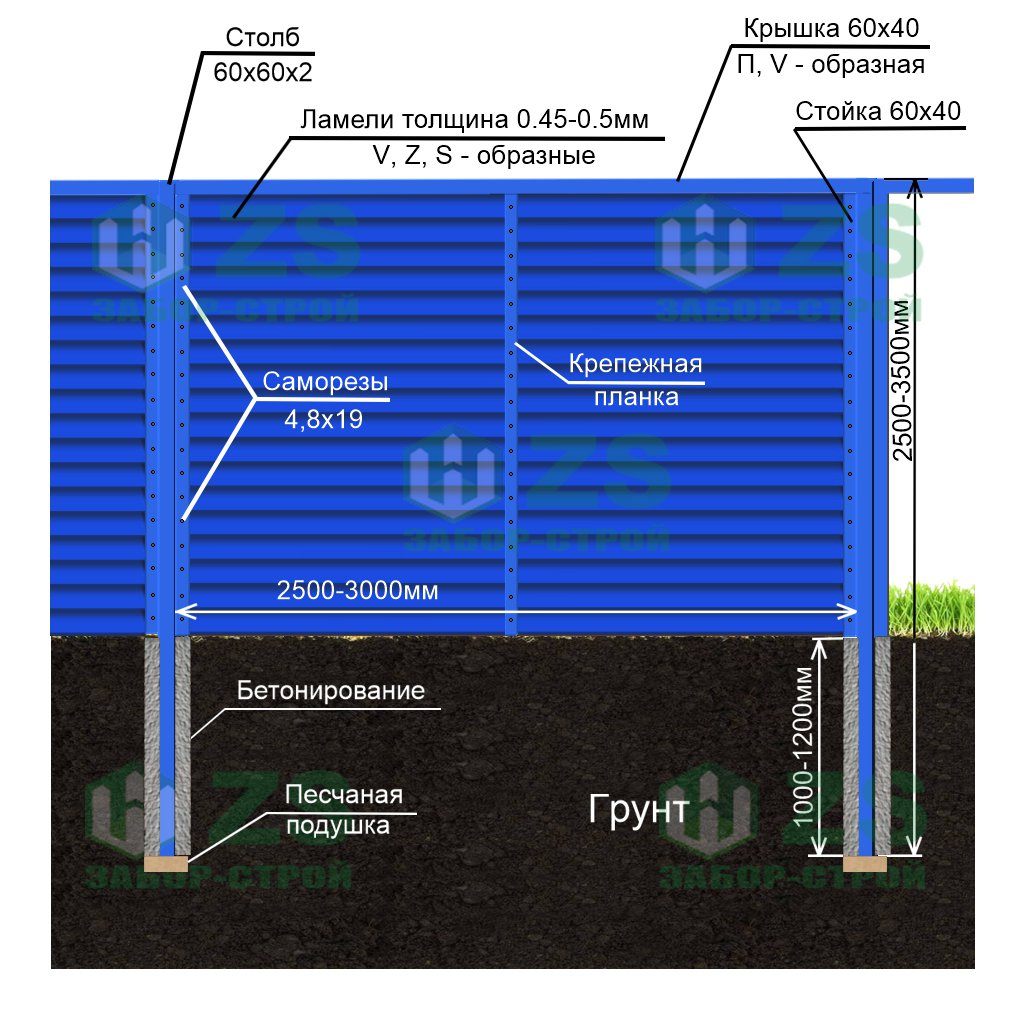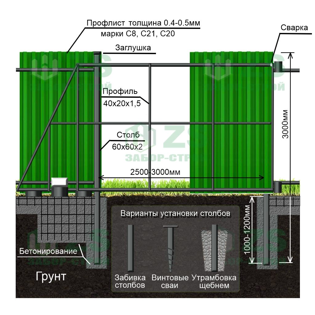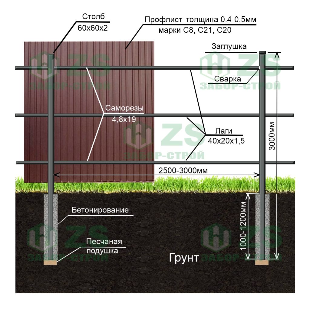 Конструкция забора из профнастила с бетонированием столбов: