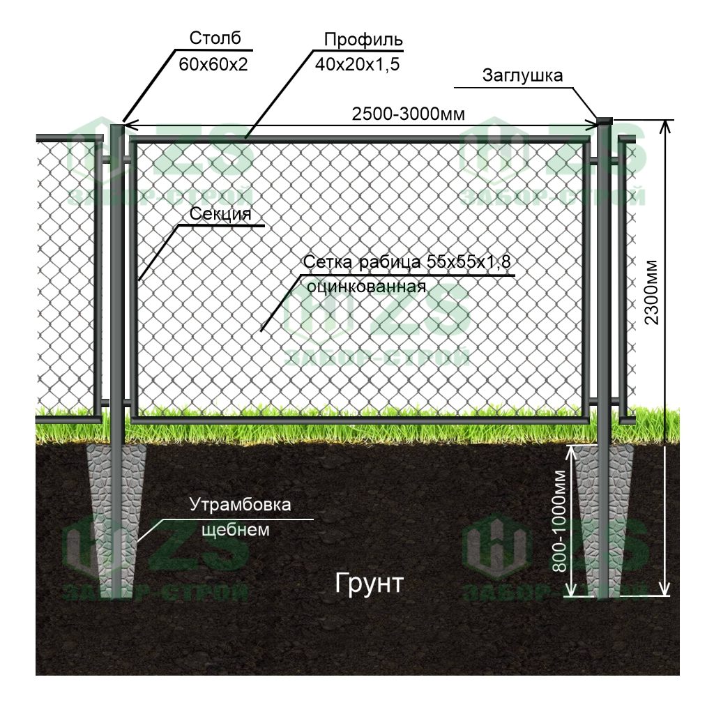 Забор из сетки рабица в натяг (55х55х1,8мм):