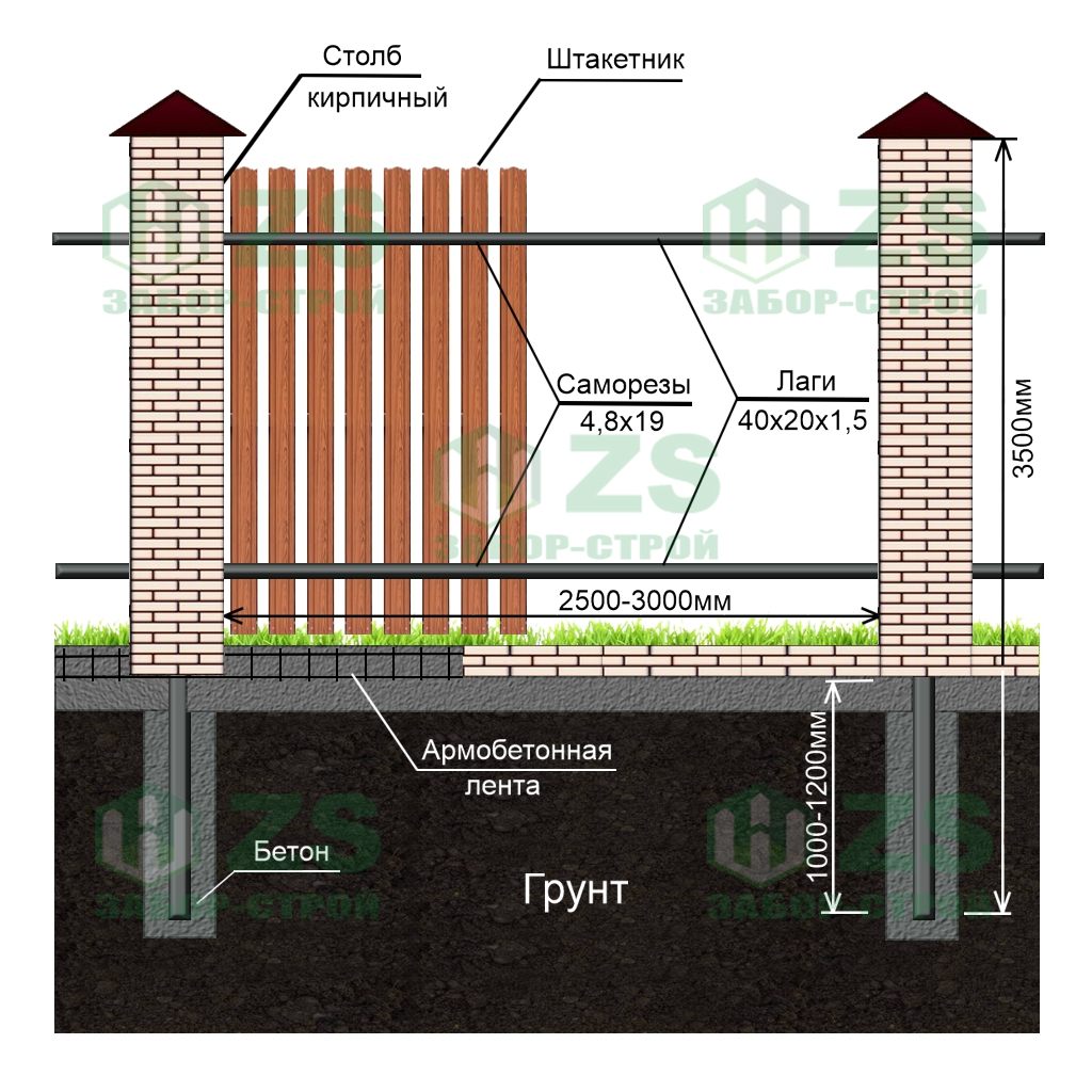Конструкция забора из евроштакетника на ленточном фундаменте с кирпичными столбами: